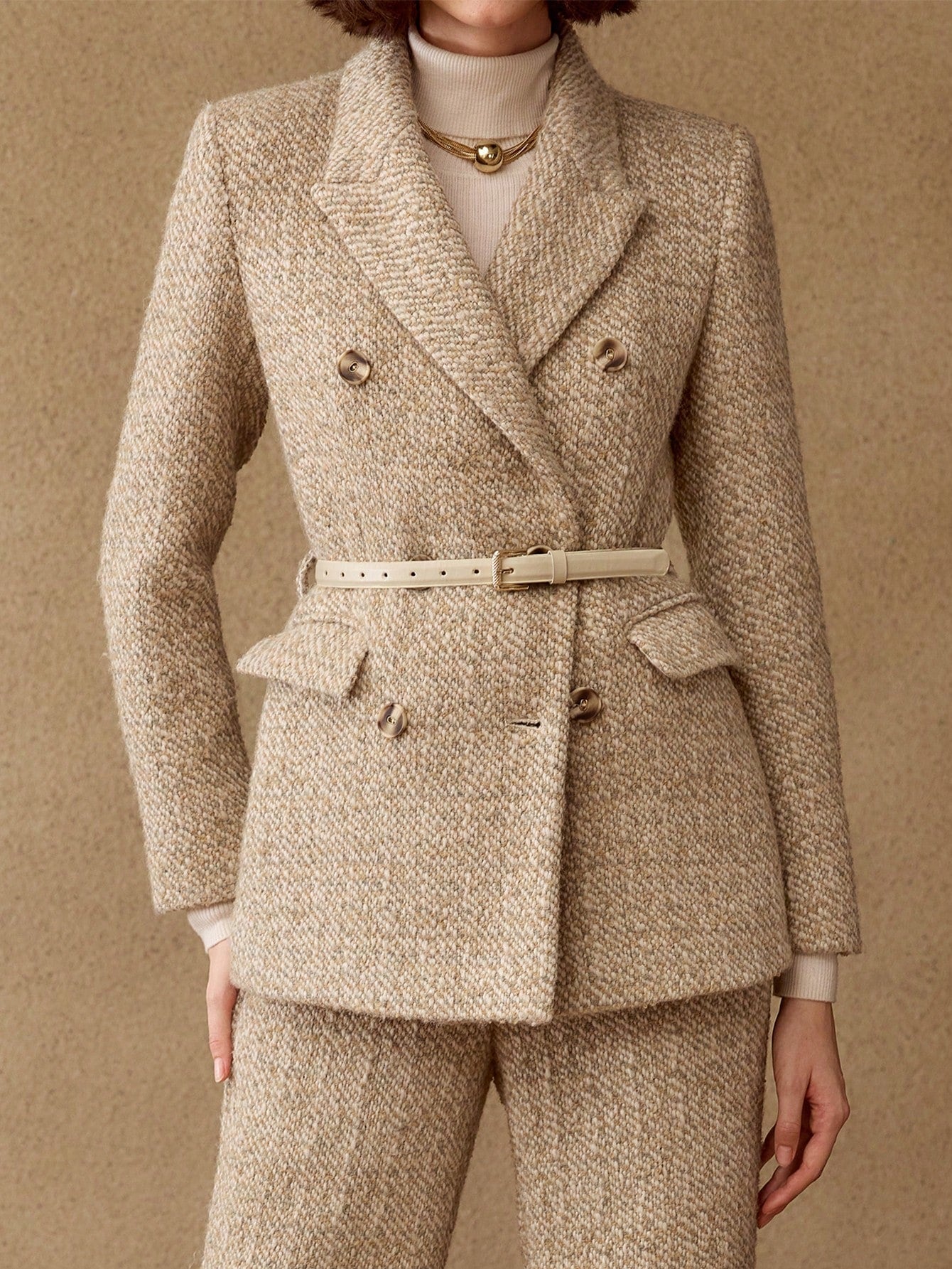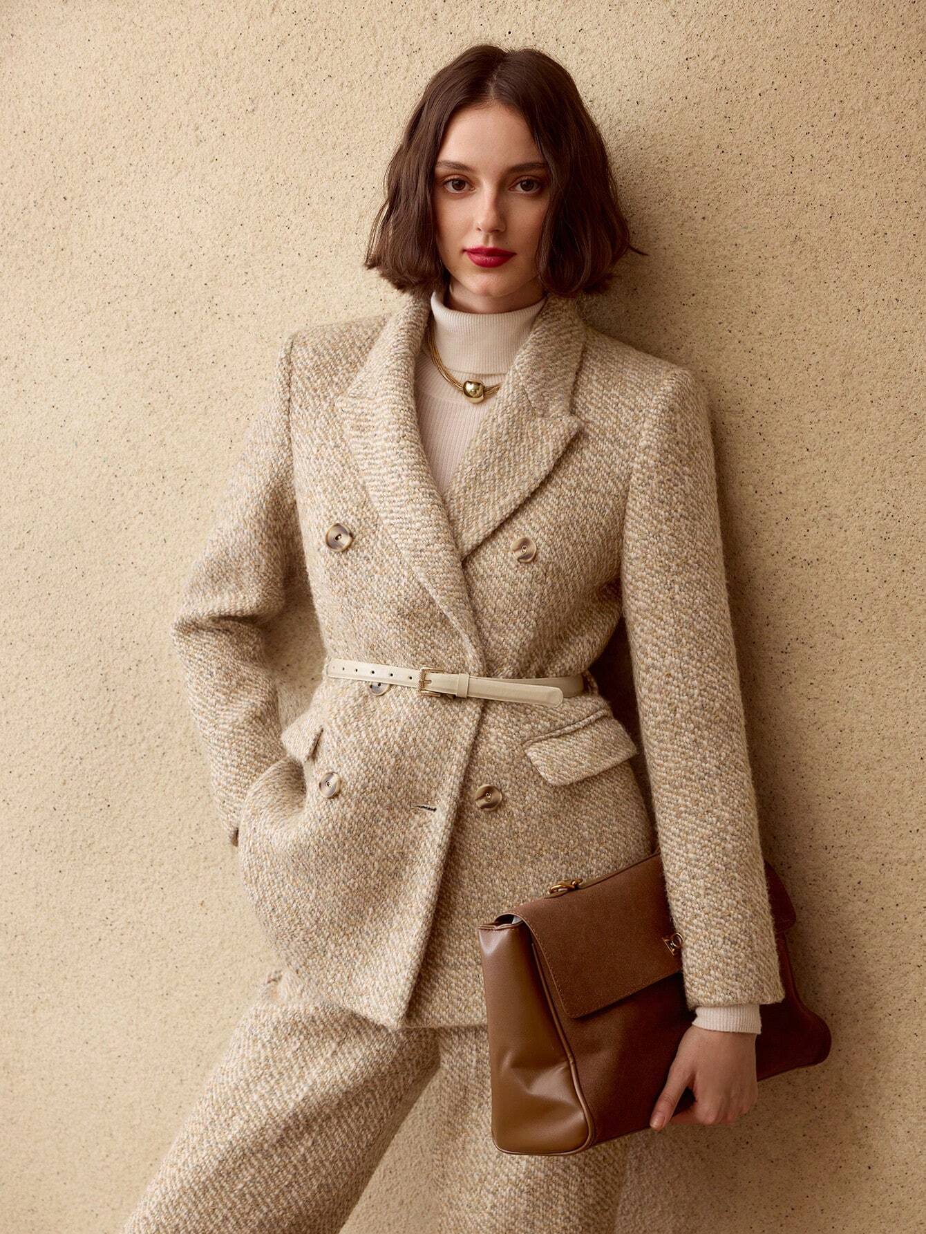 Dubbelrijige Blazer met Gespriem | Damespakken | Klassiek Tweedelig Pak met Modern Detail