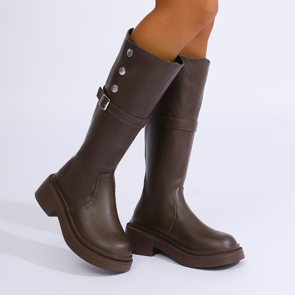 Laarzen Dames - Knie Hoge - Halfhoge Hak - Gesp Sluiting - Ronde Neus - Comfortabel All-Season Gebruik - Synthetisch Bovenmateriaal