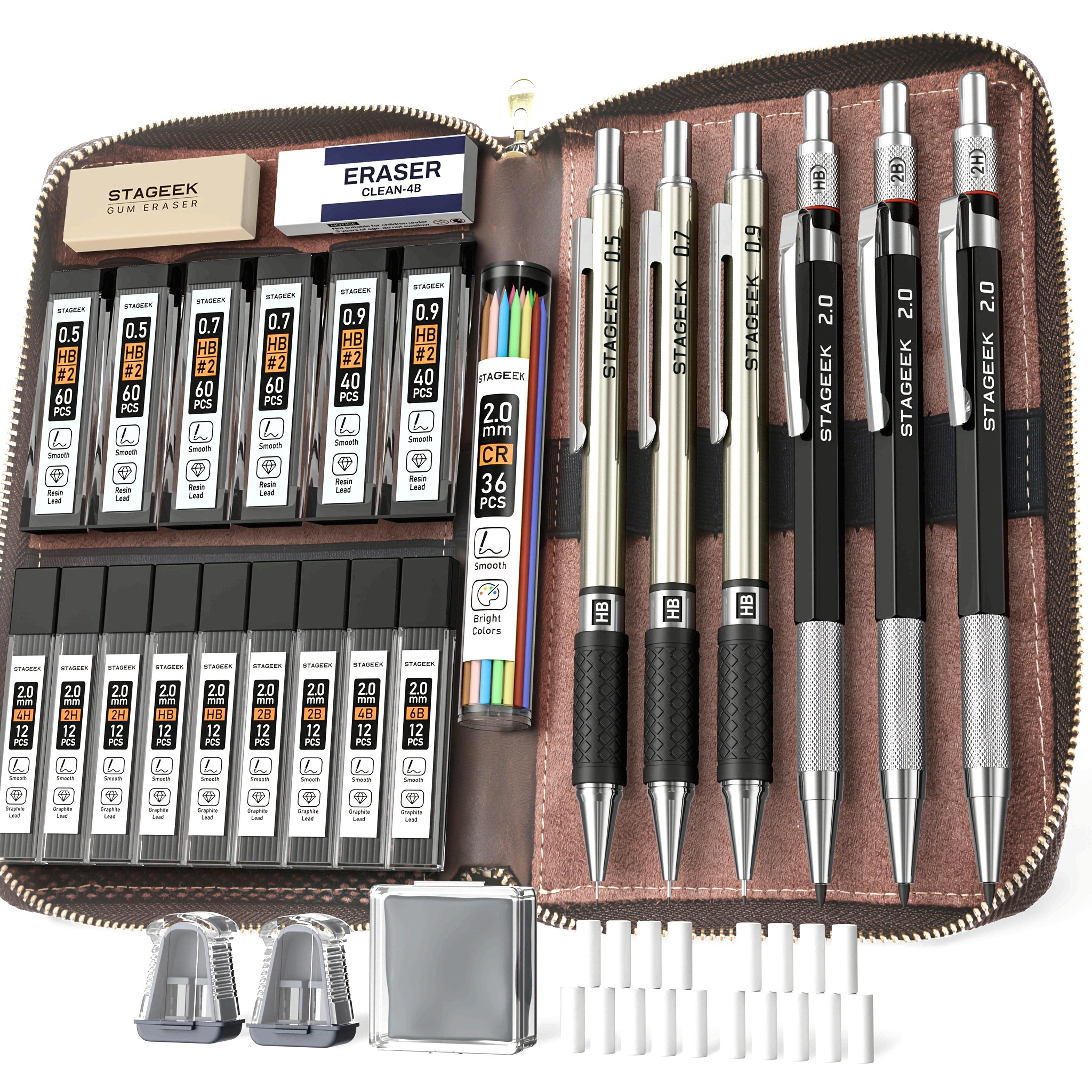 STAGEEK metalen vulpotlodenset met etui | Potlodenset | 16 navullingen in verschillende diktes voor tekenen