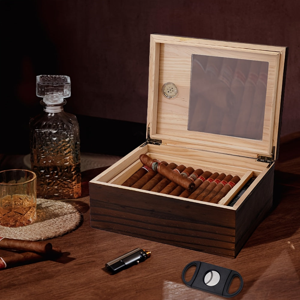 Sigarenkist van cederhout met glazen deksel | Sigarenaccessoire | Elegante humidor met hygrometer, bevochtiger en sigarenknipper